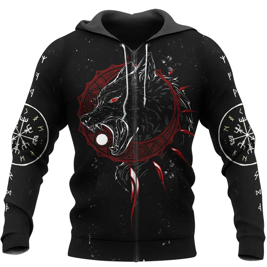 Viking hoodie and wolf hoodie in one design, featuring Hati and Skoll — the twin wolves of Norse legend chasing the sun and moon.