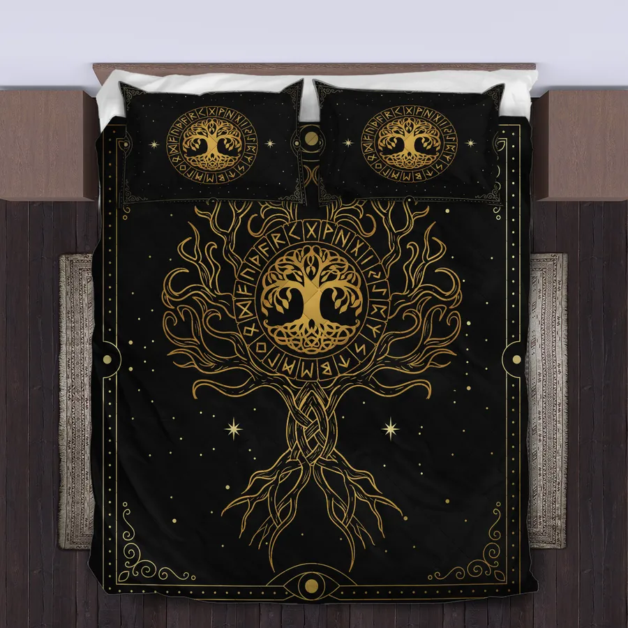 Illuminate your room with a Viking quilt bedding set featuring the Golden Tree of Life—symbolizing radiant heritage, prosperity, and timeless Norse wisdom.