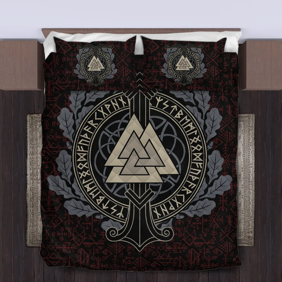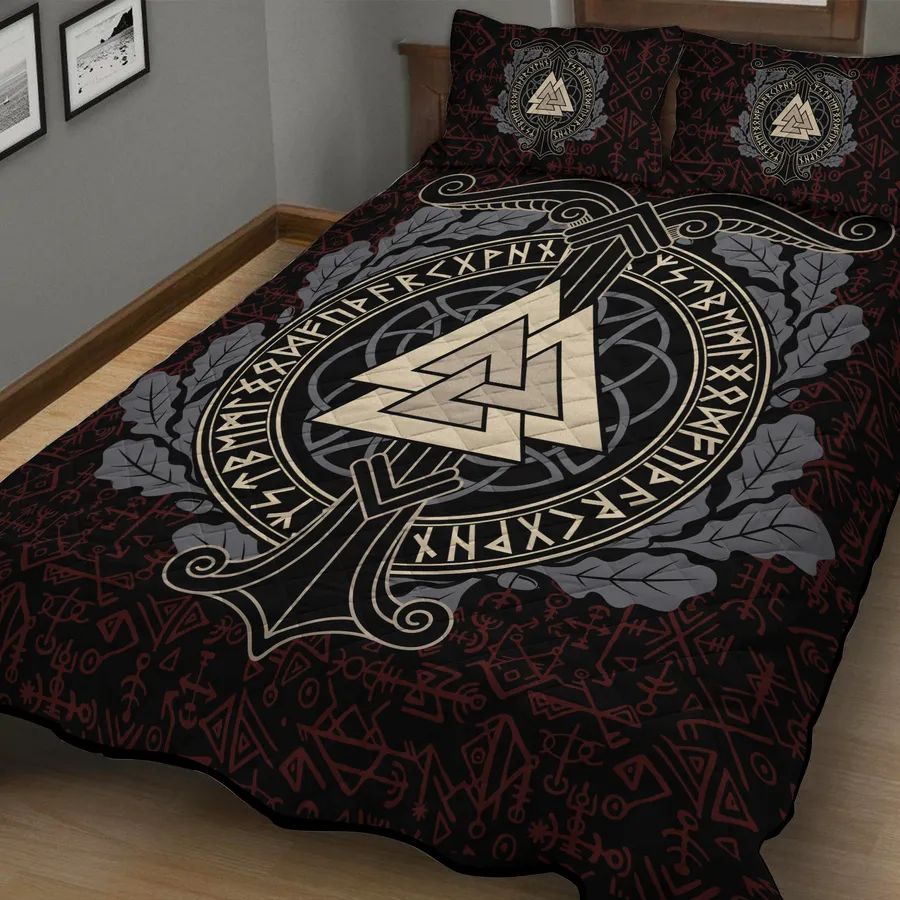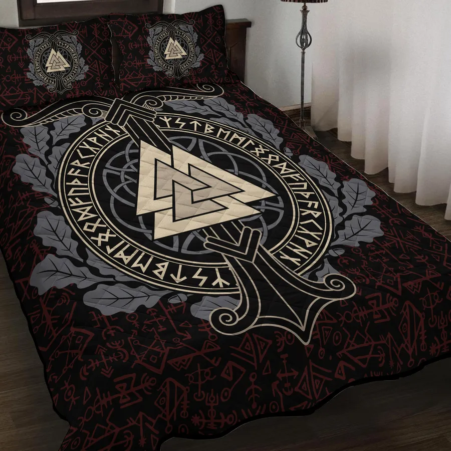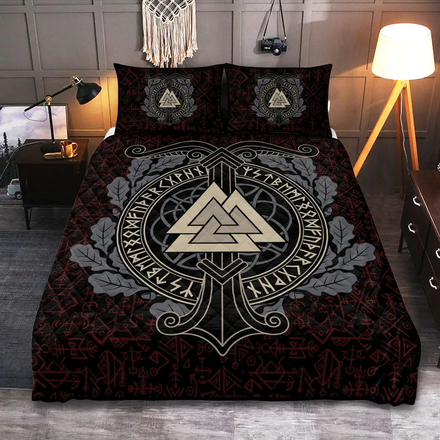 Sleep beneath the sign of the gods with a Viking quilt bedding set adorned with the Valknut symbol, channeling mystic power and the legacy of Norse warriors.